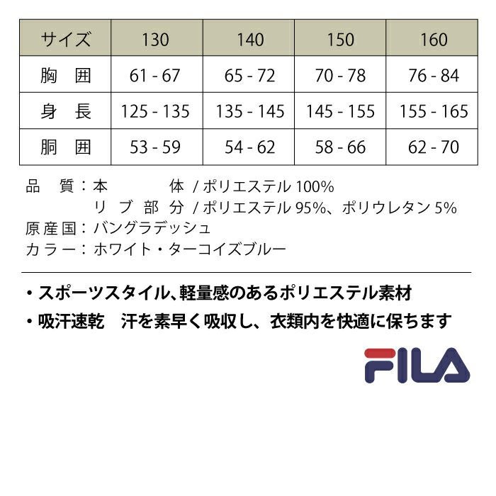 【FILA】フィラ 半袖 Tシャツ 男の子 小学生 キッズ スクール FILA 子供 学校T ブランドTシャツ 子ども スポーツウェア ポリエステル100% ホワイト ターコイズブルー 130 140 150 160 D2208 キッズ アクティブ スポーツ 速乾