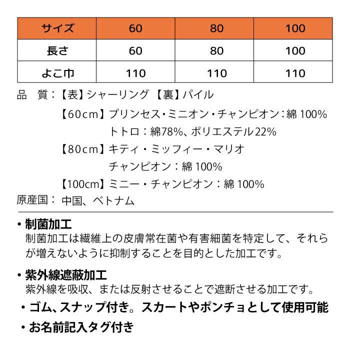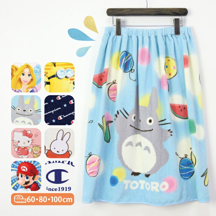 ラップタオル 巻きタオル プールタオル 水泳 プール スイミング キッズ 子供 キャラクター ディズニー ミニープリンセス キティ ミッフィー ミニオン マリオ トトロ チャンピオン 60cm丈 80cm丈 100cm丈 キッズ こども 小学生 高学校 プール 授業 男の子 女の子