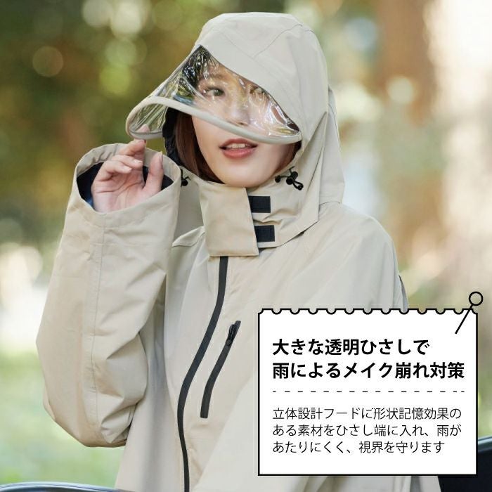 ・大きな透明ひさし付きの立体設計フードを採用。顔に雨があたりにくく、視界を守りメイク崩れも起こりにい。