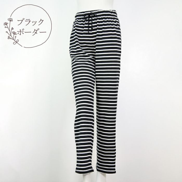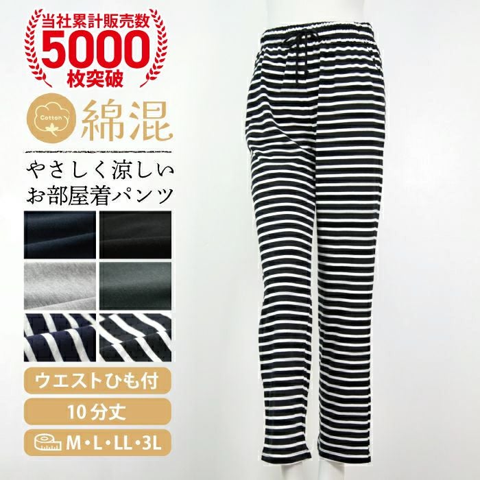 ロングパンツ レディース ルームウエア 部屋着 ボーダー 無地 ブラック ネイビー グレー ウエスト調整ひも付き 送料無料 綿混 M L LL 3L ストレッチ性有り 10分丈