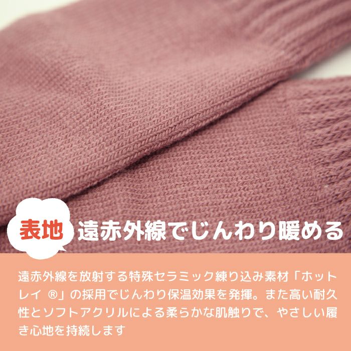 遠赤外線を放射する特殊セラミック練り込み素材「ホットレイ」の採用でじんわり温熱効果を発揮。また高い耐久性とソフトアクリルによる柔らかな肌触りで、やさしい履き心地を持続します。
