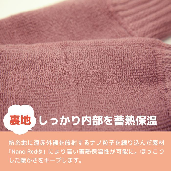 紡糸時に遠赤外線を放射するナノ粒子を練り込んだ素材「NanoRed」により高い蓄熱保温性が可能に。ほっこりとした暖かさをキープします。