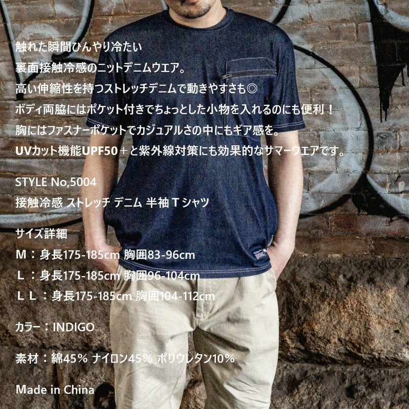 デニム 半袖 Tシャツ メンズ 接触冷感 インディゴ コトブキニット ポケット付き ストレッチ UVカットM L LL