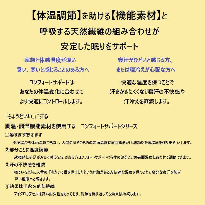 体温調節を助ける機能素材と呼吸する繊維の組み合わせで安定した眠りをサポートする製品シリーズの商品です。丁度いい温度で幅広いシーズンでご利用いただける商品です。