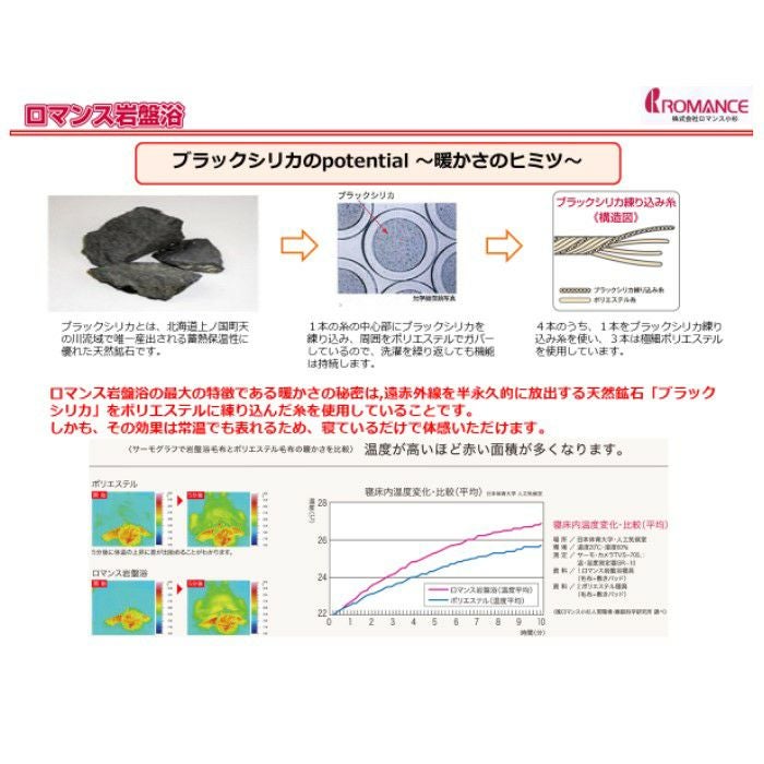 北海道上ノ国町で採取される遠赤外線効果を持つ天然鉱石「ブラックシリカ」を糸に練りこんだ商品シリーズ「ロマンス岩盤浴」の毛布です。 繊維に「ブラックシリカ」を練りこむことで、保温性を高め、体の中からじんわりと温めます。
