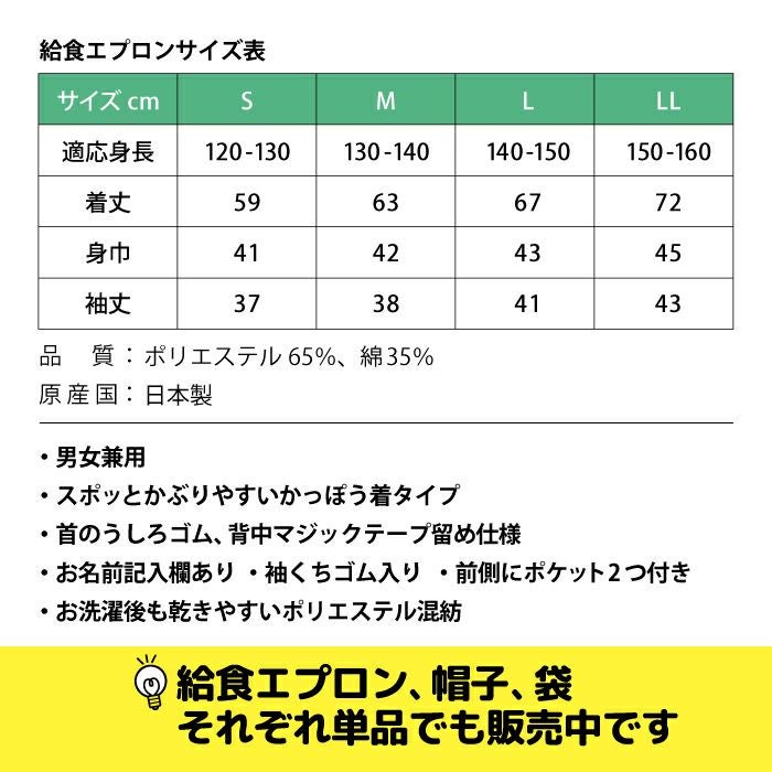 他の画像を見る 男女兼用 抗菌防臭加工 日本製 学校給食 エプロン 【公式限定10%OFF】 給食着 給食エプロン 定価 ¥ 1,650 のところ 当店特別価格 ¥ 1,485 税込 カートに入れる お気に入りに登録する